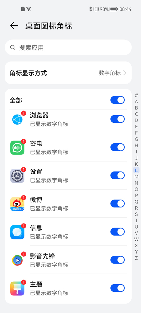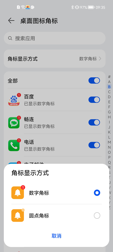 2、打开应用的角标按钮,点击【角标显示方式】,可以选择【数字角标】或【圆点角标】。