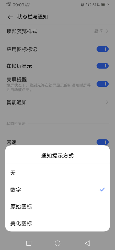2、打开【应用图标标记】按钮,点击【通知提示方式】,可以选择【数字】、【原始图标】或【美化图标】。