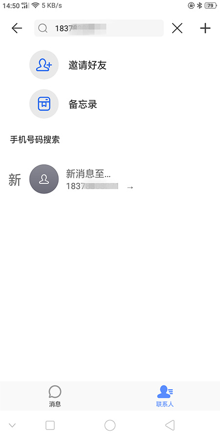 在顶部搜索框,输入名称或者电话号码,可添加或者查找好友,系统会进行是否是密电注册用户的判断: