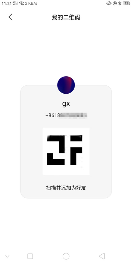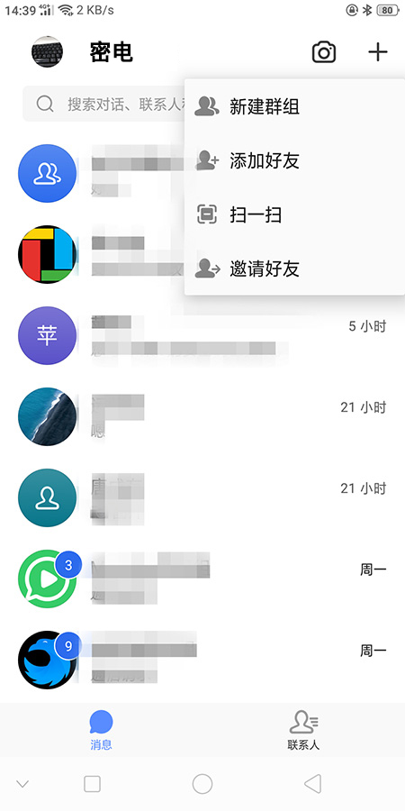 选择【扫一扫】,对着密电用户的二维码名片扫描,便可快速添加好友,或进行好友对话。(在【我的】-【我的二维码】中查看)