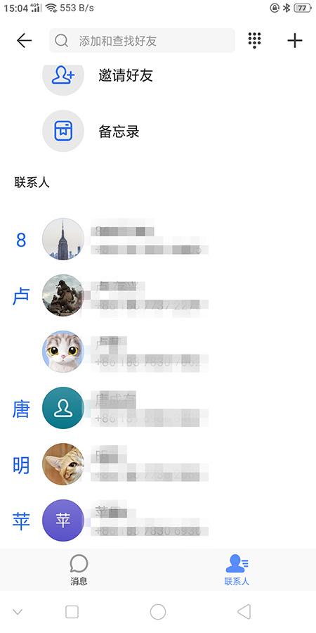 进入【好友列表】界面,选择好友,可分享和发送文字、表情、语音、图片、视频、 GIF 图片以及文件、联系人甚至是位置信息;还可以高清音频或视频通话,让沟通变得更简单。