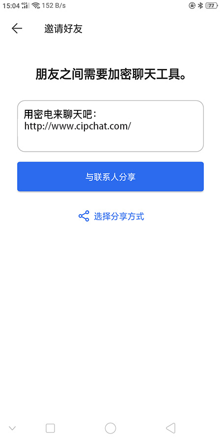 可通过微信、QQ、短信等方式将软件下载链接一键分享给手机联系人或第三方APP好友,让小伙伴一同来体验密电端对端加密沟通的安全感。