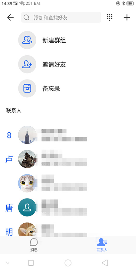 已经添加的好友也会显示在此联系人列表内,可直接查找。
