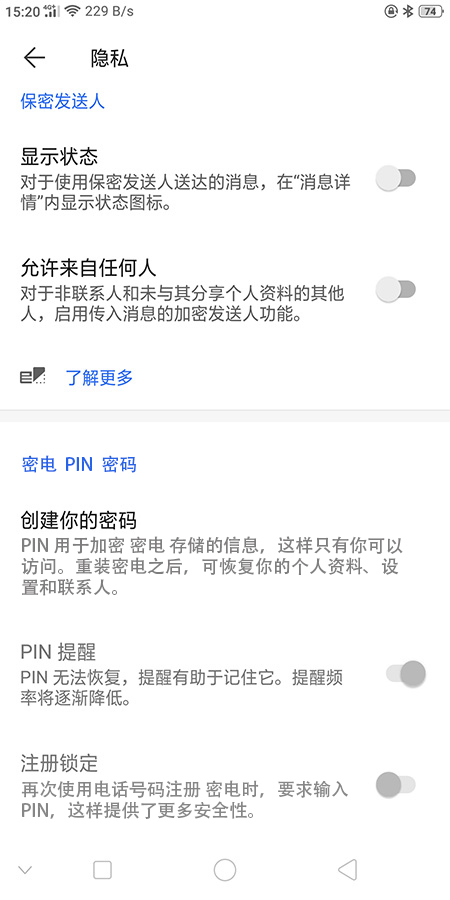 密电【设置】-【隐私】-【注册锁定】,选择开启后,输入4-20位的PIN码,可用于加密存储信息和访问安全,l防止他人通过别人电话号码使用密电。