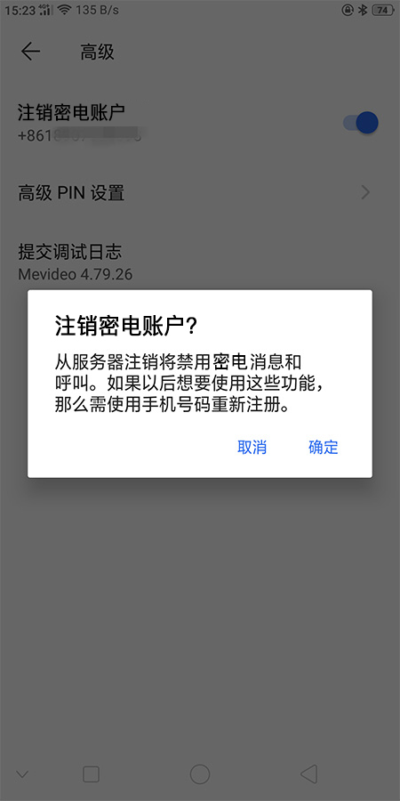 4.【高级】中,选择【注销密电账户】,会删除该账户所有相关信息,包括好友、个人信息,聊天记录等。
