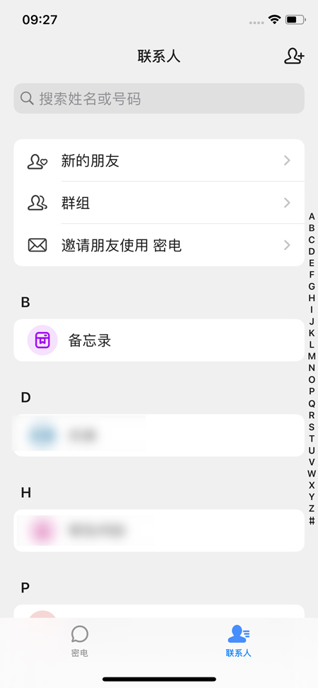 点击首页底部的【联系人】按钮,进入“联系人及好友列表”界面,设备会自动识别手机通讯录当中已经下载了密电的用户,可直接选择添加其中的联系人为密电好友。