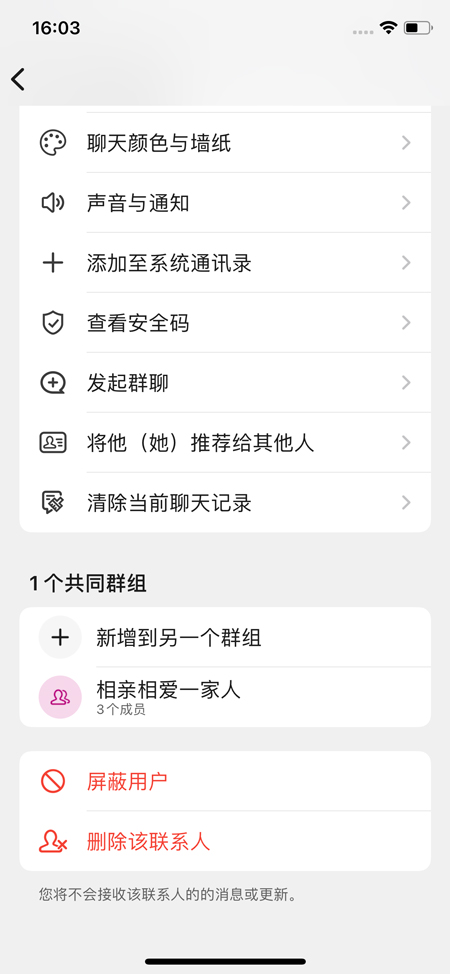 点击对话或群聊中的联系人头像,选择“屏蔽”“屏蔽用户”“屏蔽群组”后,您将不再接收该聊天对话的消息或更新。