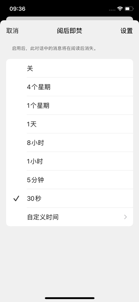 在聊天设置中,可选择开启【阅后即焚】,此后在好友或群组聊天中发送和接收的消息将在阅读后,设置的时间内开始倒计时,如10秒后自动清除,不用再担心隐私的内容被泄漏。