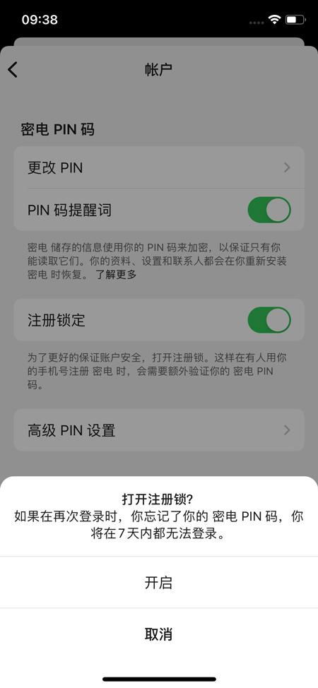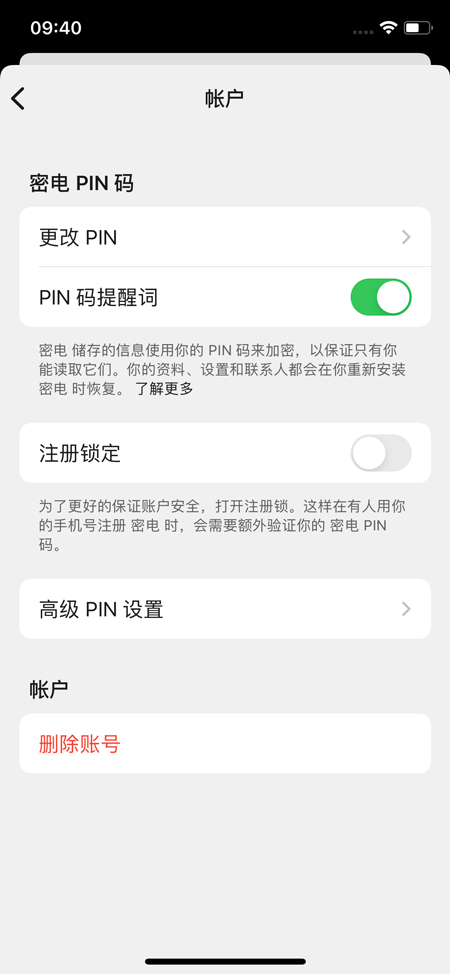 密电【我的】-【帐户】-【注册锁定】,选择开启后,输入4-20位的PIN码,可用于加密存储信息和访问安全,防止他人通过您的电话号码重新注册使用密电。