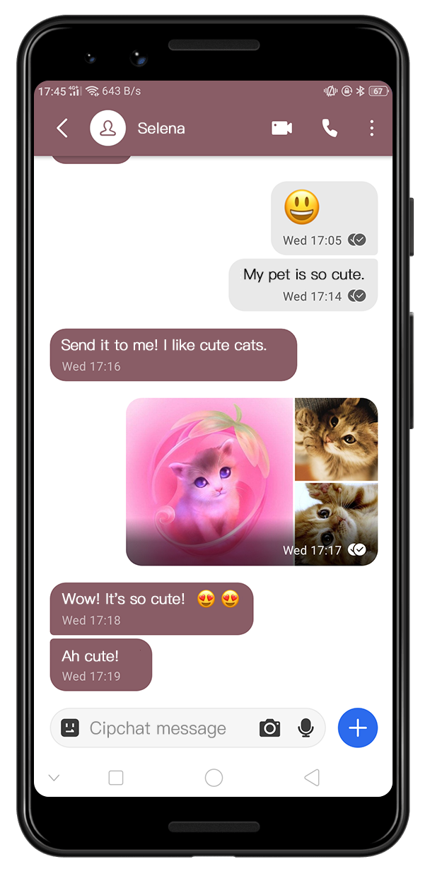 Share text, voice messages, photos, videos, GIFs and files for free. Cipchat uses your phone's data connection so you can avoid SMS and MMS fees.